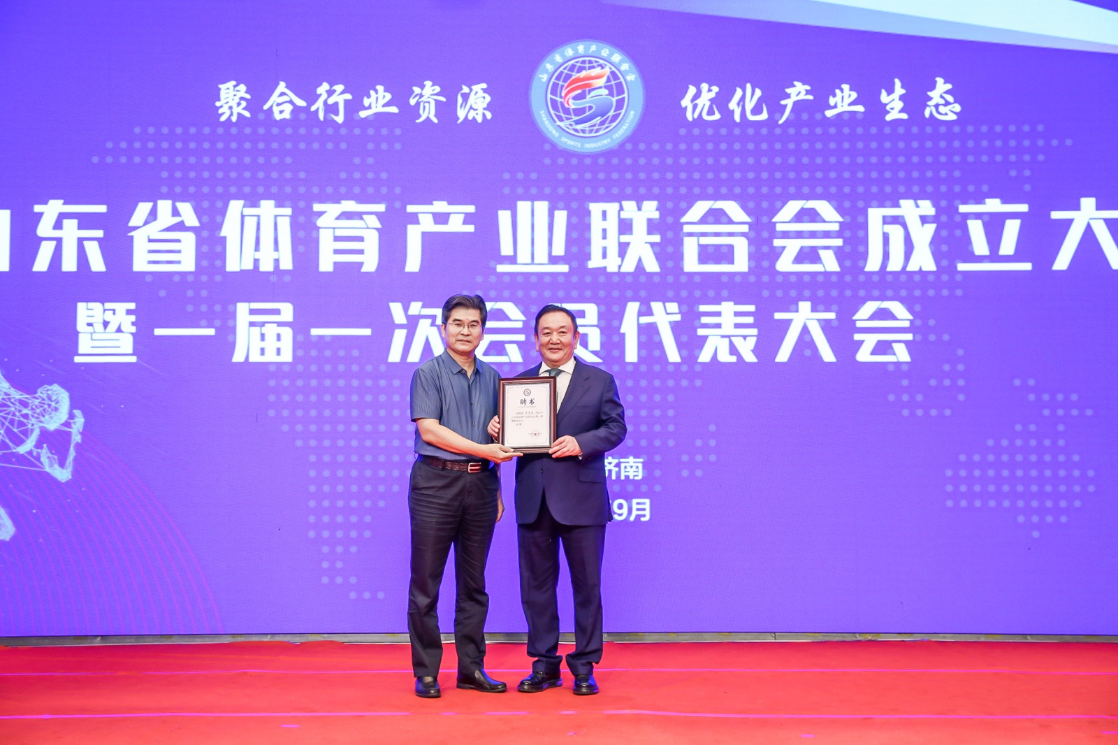 2020年9月16日,山东省体育产业联合会成立大会暨一届一次会员代表大会在山东济南隆重召开。中国体育用品业联合会主席李桦、山东省体育局副局长王延奎、中国文教体育用品协会副理事长张培生、中国体育用品业联合会副主席兼秘书长罗杰、山东省民政厅社会组织管理局二级调研员王军、山东省体育总会秘书处处长孙照亮、山东省体育局经济处处长徐金龙、山东省体育产业发展服务中心主任翟培建出席。山东省体育产业联合会近200名会员单位代表以及部分省市媒体共同参加。全国政协委员、yl8cc永利体育产业集团董事长卞志良当选首届理事会会长并发表讲话。